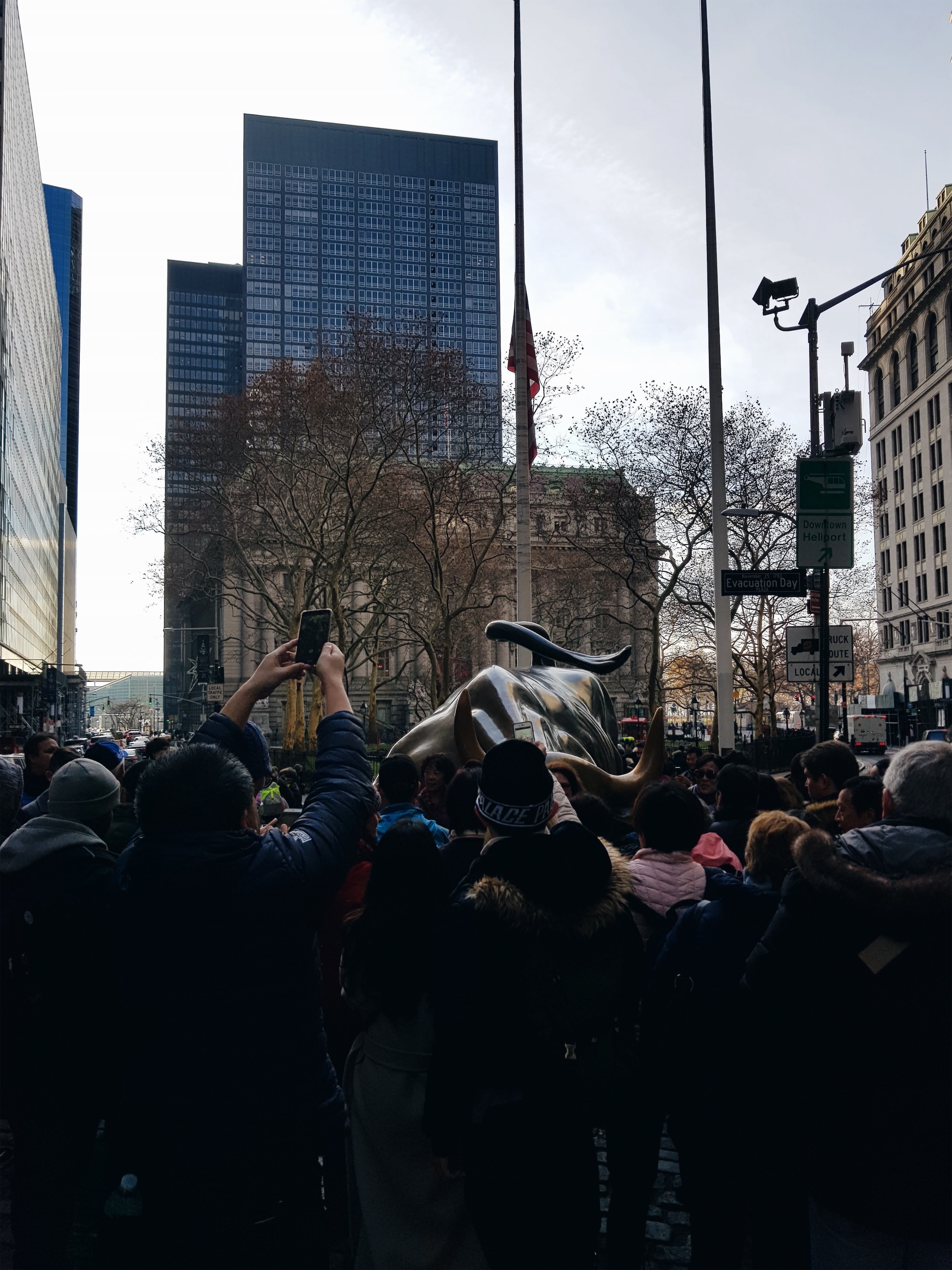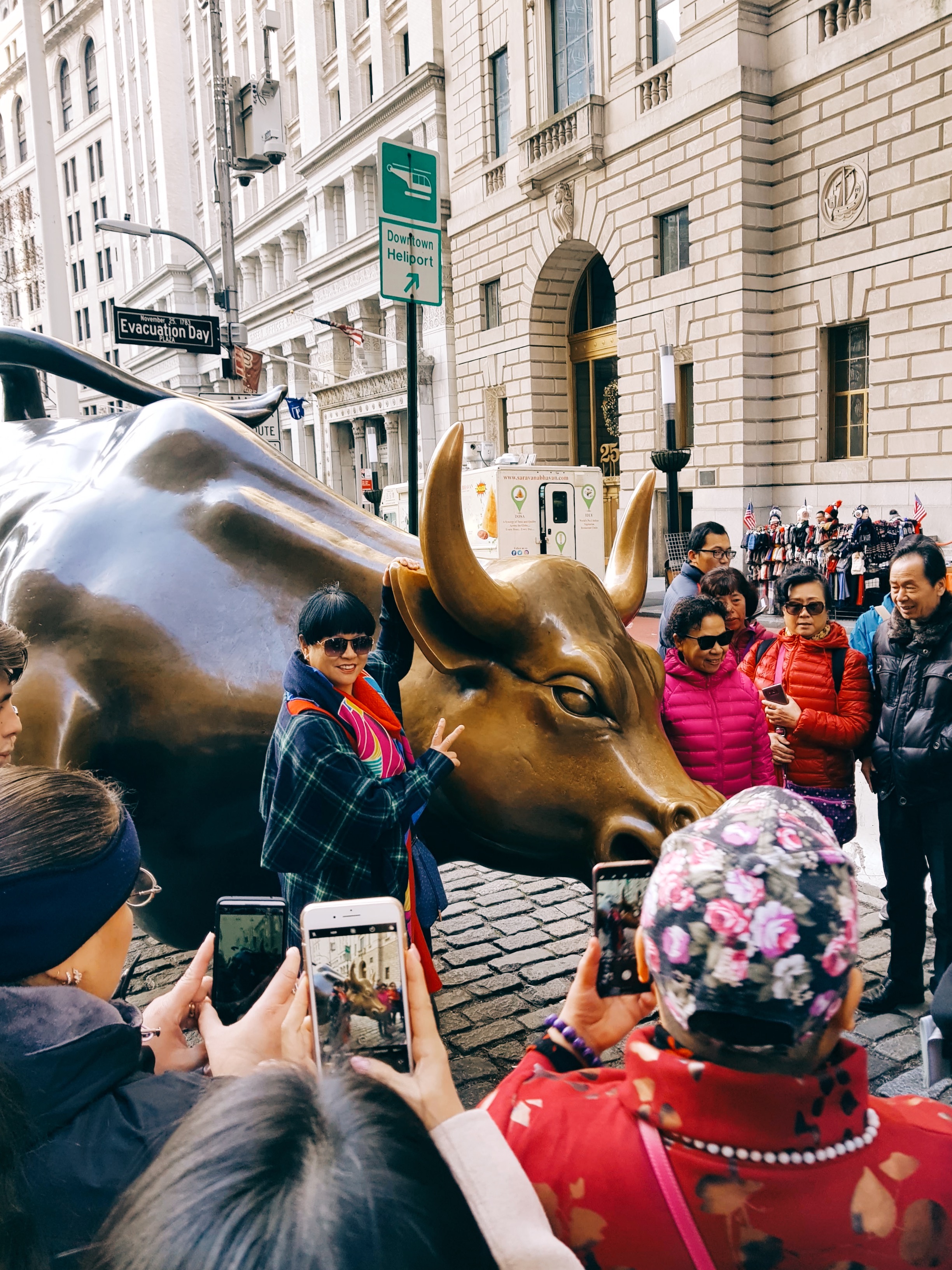 자유의여신상 한 정거장 전이 월스트리트라서 내려서 걸어가기로 했다. 월스트리트에서 황소동상에서 시간 보내며 사진을 찍었다. 뿔잡고 한번, 거기잡고 한번 찍었는데, 둘 다 만져야 효과가 있다고하니, 잊지 마시길.