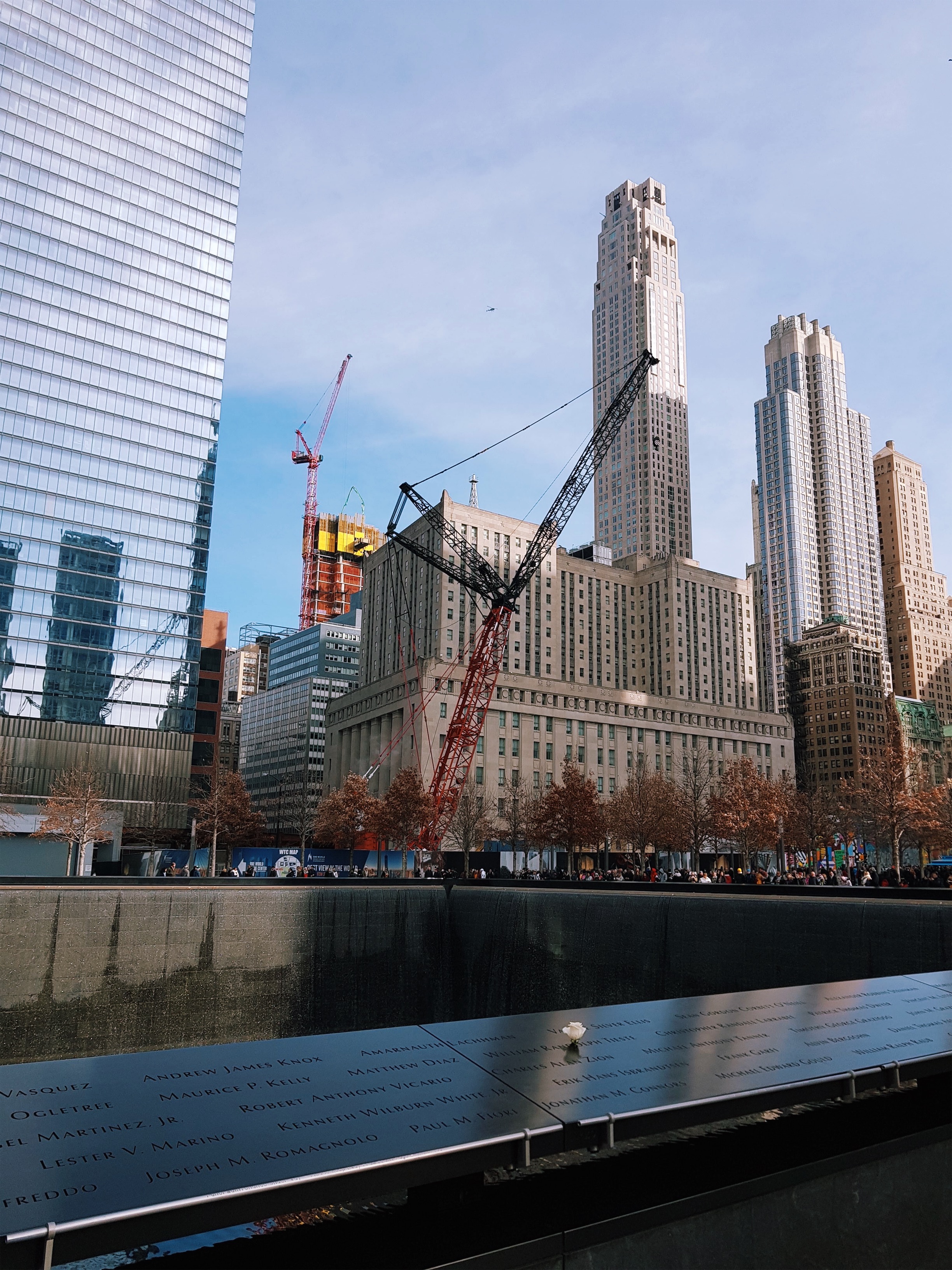 911메모리얼파크로 향했다. 911테러로 인해 붕괴된 월드트레이드 센터 자리를 조형물로 대신한 곳이다. 테두리에는 희생자들의 이름이 새겨진 패널이 둘러싸여 있다.