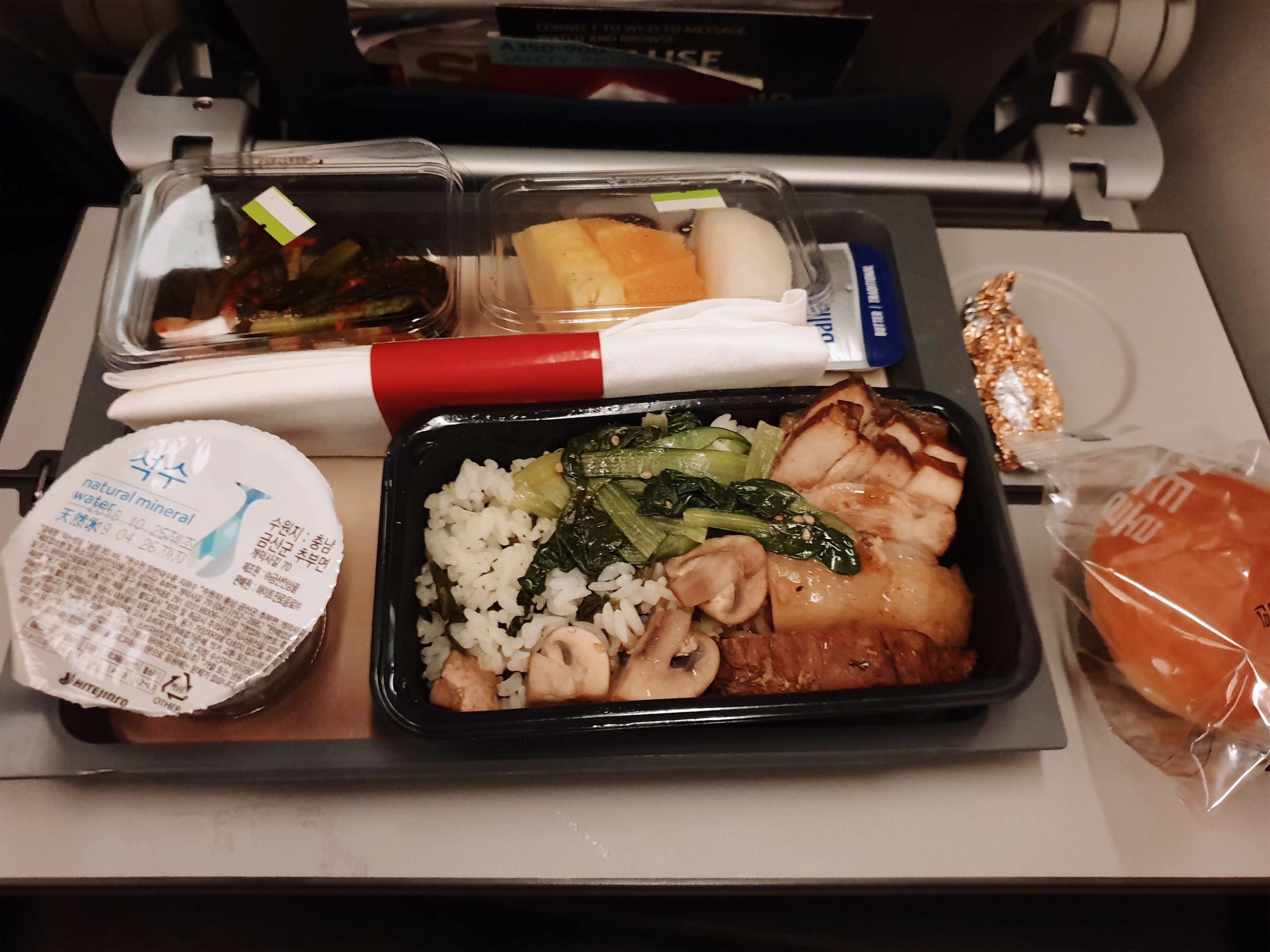 비행기에서는 가운데 자리에 앉았는데, 다행히 우리 칸에서 맨 앞이라 편했다. 자리에 갔을때 의자 위에 안대, 베개, 담요가 있었다.