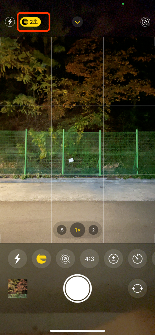 아이폰의 야간모드는 아쉬운 것이, 내가 야간모드를 결정 할 수 없다. 주변환경에 빛이 부족하면 자체적으로 판단해서 야간모드를 활성화 시킨다. 위 사진의 구석에 '2초'가 표시된 모습이 그것이다. 어두울수록, 흔들림이 적을 수록 저 시간이 길어지며, 그만큼 오랫동안 빛을 모으기 때문에 그 시간동안 흔들림 없이 들고 있어야 한다. 아예 스탠드에 고정시켜 놓을 경우, 최대 30초까지 늘어난다고 한다. 보통 손으로 들고 찍을 경우, 5초까지가 일반적이다.